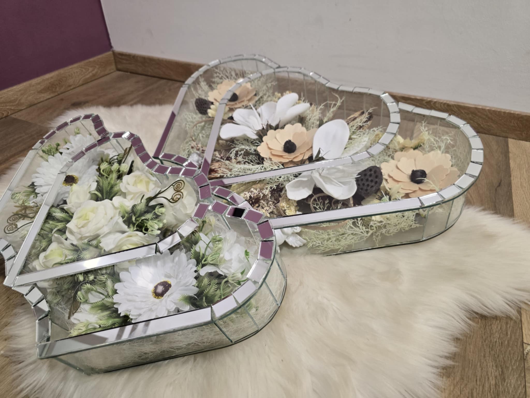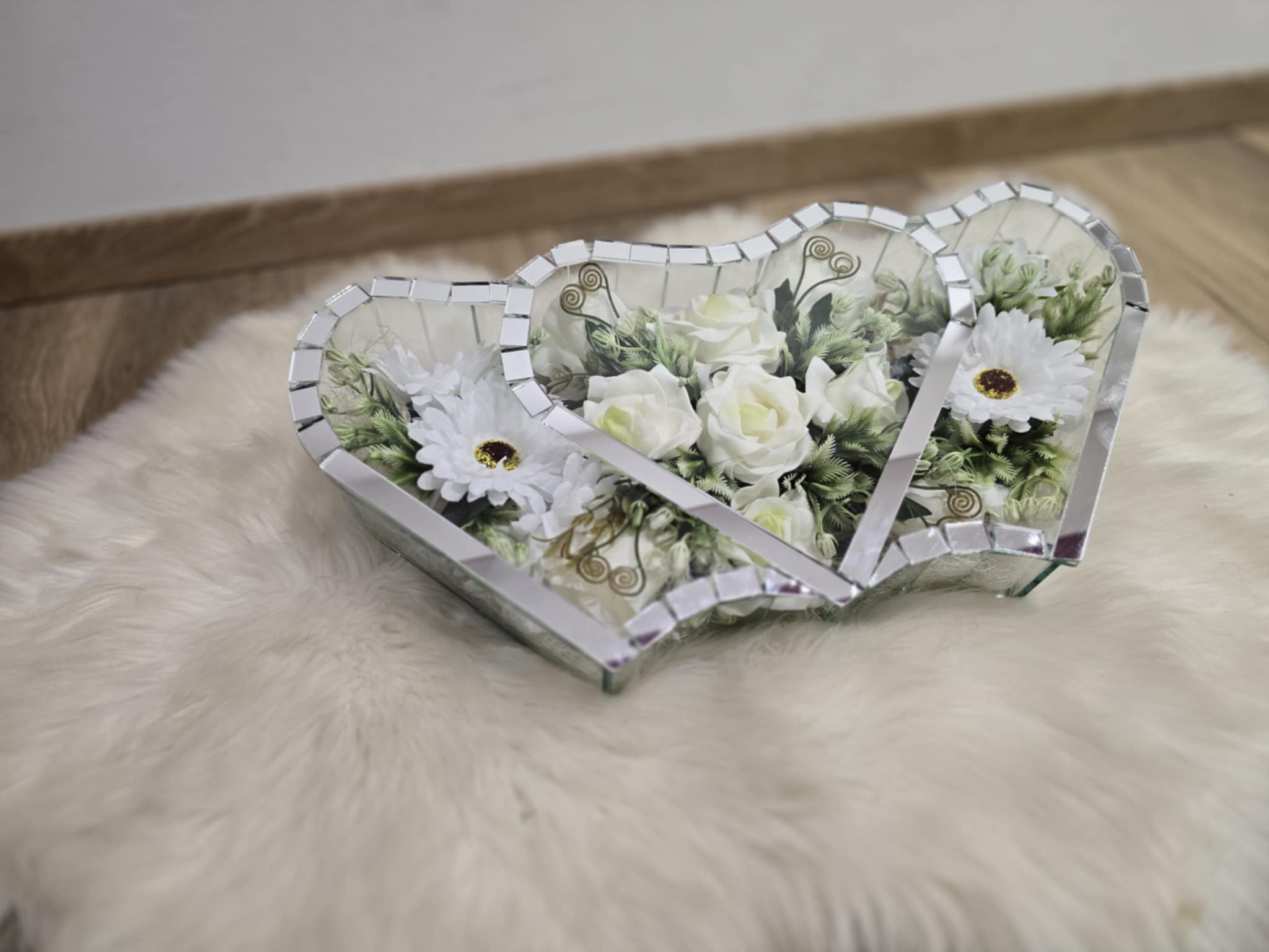 Stakleni aranžman s umjetnim cvijećem u obliku troduplog srca